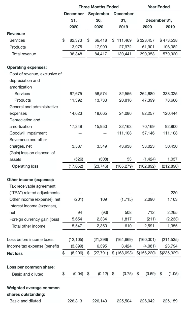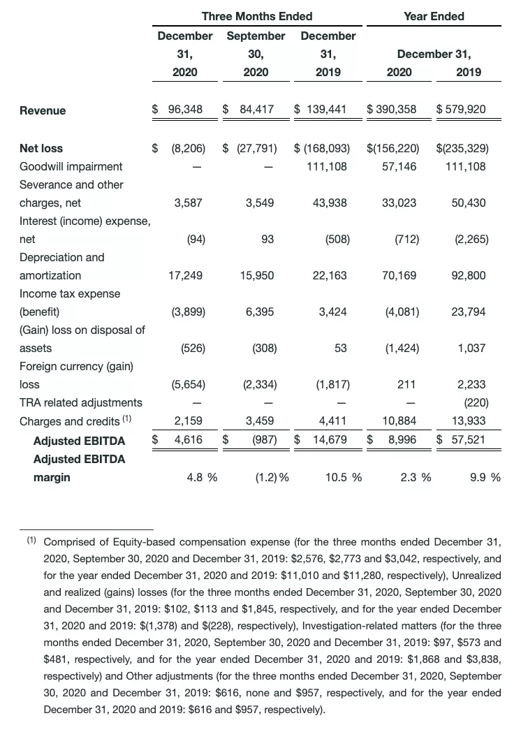 The Company defines adjusted net loss as net loss before goodwill impairment and severance and other charges, net, net of tax. The Company defines adjusted net loss per share as net loss before goodwill impairment and severance and other charges, net, net of tax, divided by diluted weighted average common shares. The Company defines free cash flow as net cash provided by (used in) operating activities less purchases of property, plant and equipment and intangibles. The Company defines adjusted EBITDA as net income (loss) before interest income, net, depreciation and amortization, income tax benefit or expense, asset impairments, gain or loss on disposal of assets, foreign currency gain or loss, equity-based compensation, the effects of the tax receivable agreement, unrealized and realized gains or losses and other non-cash adjustments and other charges or credits. The Company uses adjusted EBITDA to assess its financial performance because it allows the Company to compare its operating performance on a consistent basis across periods by removing the effects of its capital structure (such as varying levels of interest expense), asset base (such as depreciation and amortization), income tax, foreign currency exchange rates and other charges and credits. The Company defines adjusted EBITDA margin as adjusted EBITDA divided by total revenue.