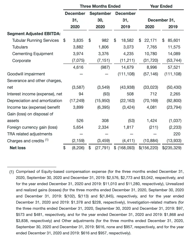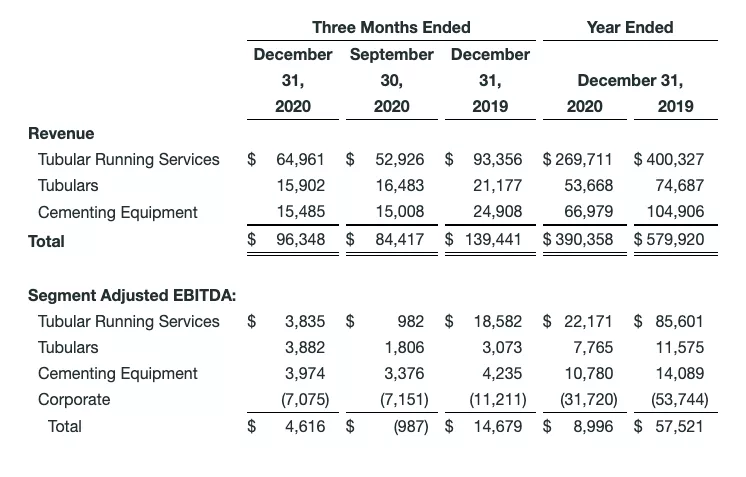 “In past quarters, I have acknowledged the dedication and resiliency of our workforce and I remain extremely proud of how our organization has stayed focused on managing things within its control and continuing to deliver excellent service quality to all our customers. The challenges we have overcome place our organization in a position of strength as we enter 2021. We saw positive operational momentum build in the fourth quarter of 2020 and we expect to see further gains as we move through the year. For 2021, we will remain focused on growing our Tubulars segment in select markets and continuing the expansion of our Cementing Equipment segment internationally. Even though the market is improving, and customer demand is increasing, we will maintain our disciplined approach to our capital spending and stay focused on properly managing our overall cost structure. We have built a solid operational platform that will enable our organization to continue to improve our service offerings and to bring additional technologies to market, that will not only reduce costs for our customers, but for our organization as well. In 2021 our focus remains on generating long-term value for our stakeholders, generating free cash flow, and bringing differentiated technologies to the market,” concluded Mr. Kearney.