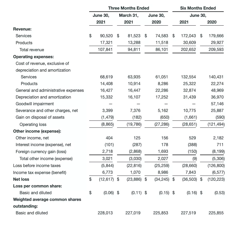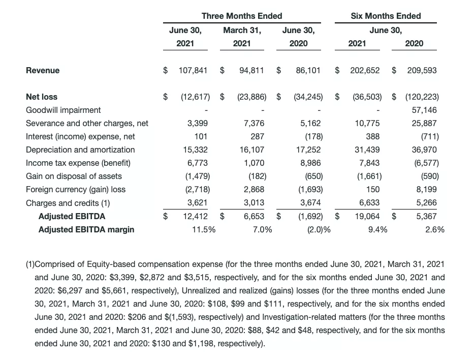 The Company defines adjusted net loss as net loss before goodwill impairment and severance and other charges, net, net of tax. The Company defines adjusted net loss per share as net loss before goodwill impairment and severance and other charges, net, net of tax, divided by diluted weighted average common shares. The Company defines free cash flow as net cash provided by (used in) operating activities less purchases of property, plant and equipment. The Company defines adjusted EBITDA as net income (loss) before interest income, net, depreciation and amortization, income tax benefit or expense, asset impairments, gain or loss on disposal of assets, foreign currency gain or loss, equity-based compensation, the effects of the tax receivable agreement, unrealized and realized gains or losses and other non-cash adjustments and other charges or credits. The Company uses adjusted EBITDA to assess its financial performance because it allows the Company to compare its operating performance on a consistent basis across periods by removing the effects of its capital structure (such as varying levels of interest expense), asset base (such as depreciation and amortization), income tax, foreign currency exchange rates and other charges and credits. The Company defines adjusted EBITDA margin as adjusted EBITDA divided by total revenue.