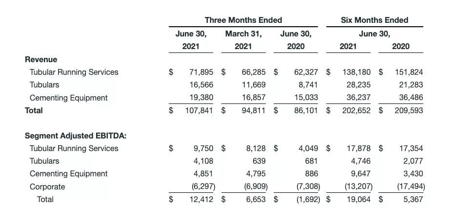 Segment adjusted EBITDA in the second quarter of 2021 totaled $4.1 million, or 25% of revenue, compared to $0.6 million, or 5% of revenue, in the first quarter of 2021, and $0.7 million, or 8% of revenue, in the second quarter of 2020. Improvement in margins were driven by increased activity levels and product mix. First quarter results were negatively impacted by higher product costs related to a significant tubular delivery.