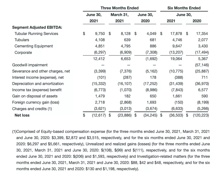 Tubulars revenue in the second quarter of 2021 totaled $16.6 million, compared to $11.7 million in the first quarter of 2021, and $8.7 million in the second quarter of 2020. Improvements were driven by higher tubular product sales, including an international tubular delivery, and increased drilling technologies activity.