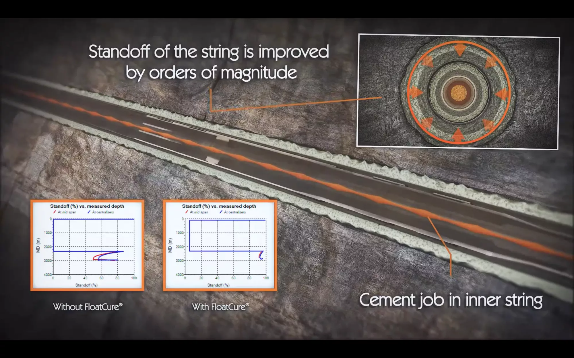 FloatCure® technology delivers a new level of cementing reliability by maximising the use of casing and liner buoyancy, drastically improving casing standoff whilst reducing hook-load and torque & drag by up to 80%. FloatCure® can enable the deployment and cementing of otherwise un-runnable or un-rotatable liners.